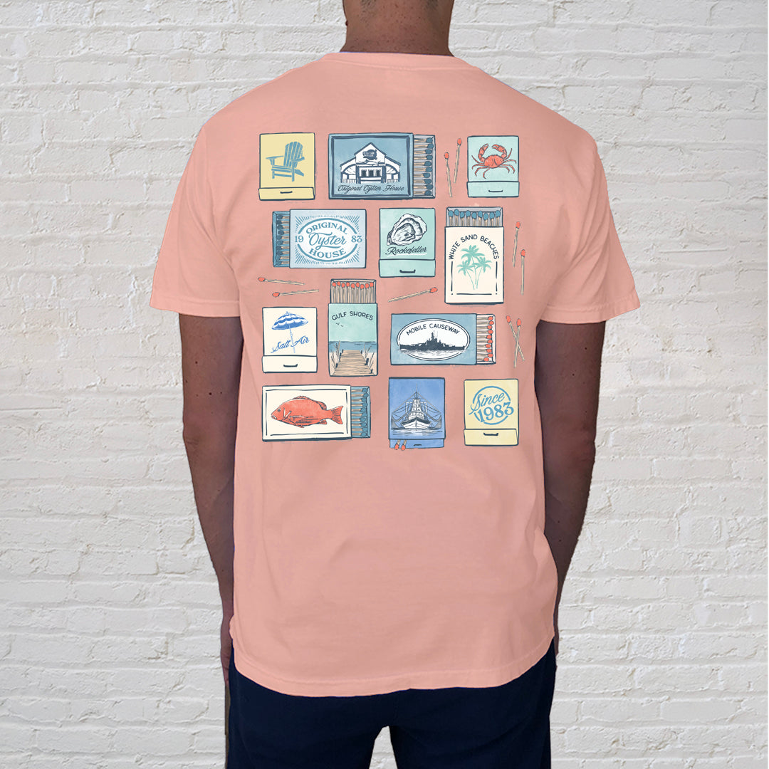 Matchbooks design features a curated lineup of vintage-inspired matchbooks, each illustrated with charming drawings. A little nostalgic, a little coastal and oysterific, this tee is a nod to seaside nights, salt air and a Gulf Coast small town you never want to leave. Thislimited edition, collectiblet-shirt features the front pocket design branded with the Original Oyster House.