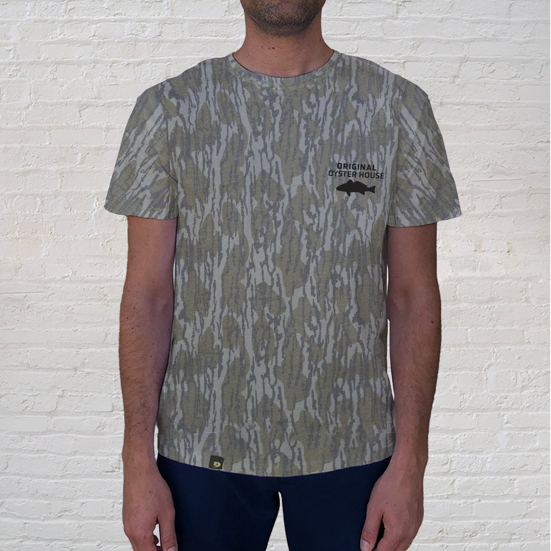 Some places stay with you. Still water. Early light. One good cast. Worn for the memorable trip, not just your catch. Redfish Mossy Oak Bottomland is the keepsake for the dedicated angler and outdoor enthusiast. Thislimited edition, collectiblet-shirt features the front and back graphic branded with the Original Oyster House name and a fish silhouette.